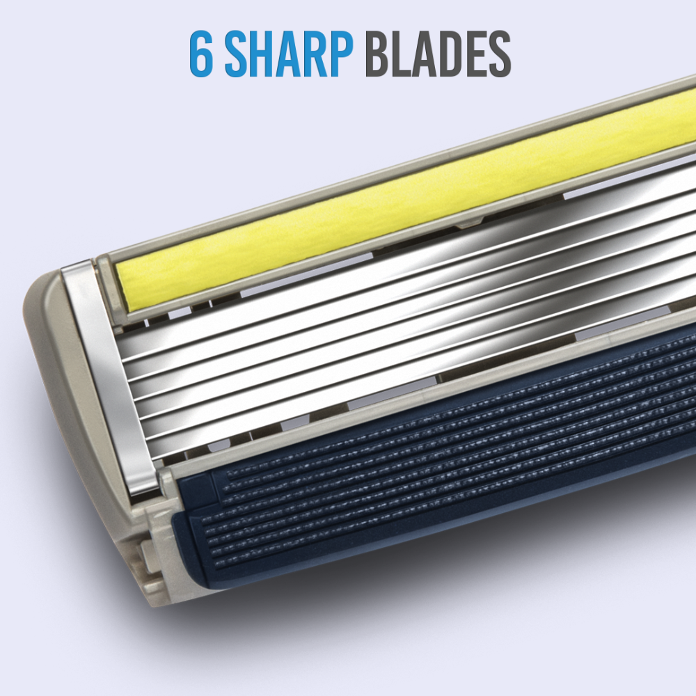 The six-blade design with a lubrication strip helps reduce irritation and is generally suitable for a variety of skin types, including sensitive skin, for a comfortable shaving experience.